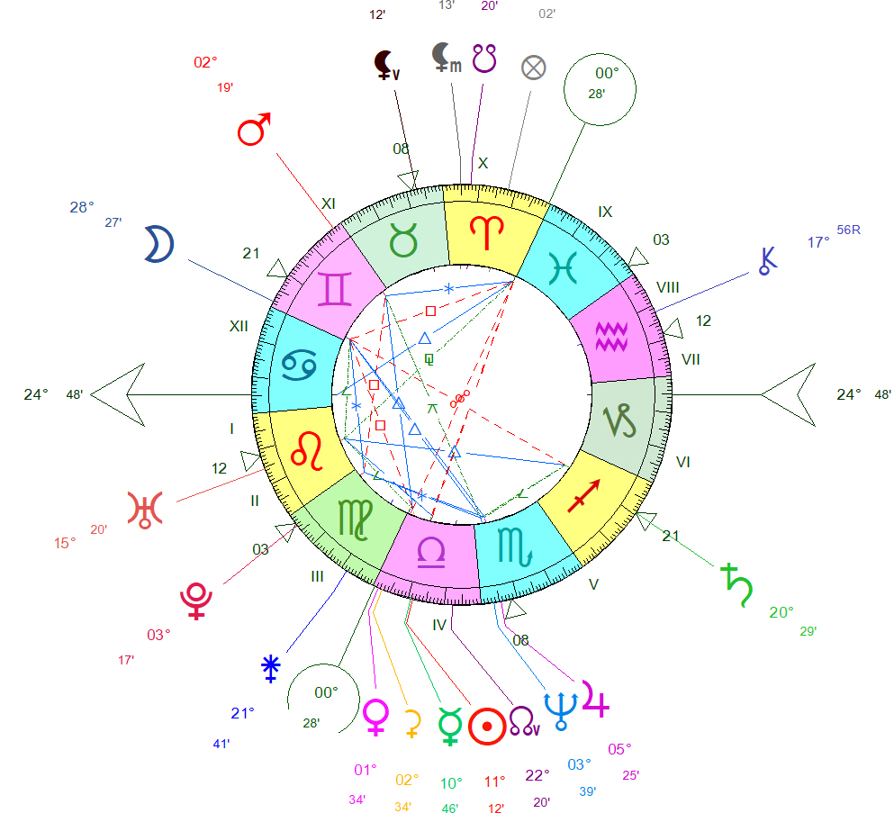 Il faut, je crois faire preuve d’humilité en se disant que la précision est, sans information complémentaire, impossible. Entre le 4 et le 5 octobre, il y a peu de différence : la Lune se trouve toujours en Gémeaux et dans les deux cas de figure (Révolution lunaire d’avril), elle est dissonante au cycle Jupiter/Neptune, mais bien sûr, l’ascendant n’est pas le même.